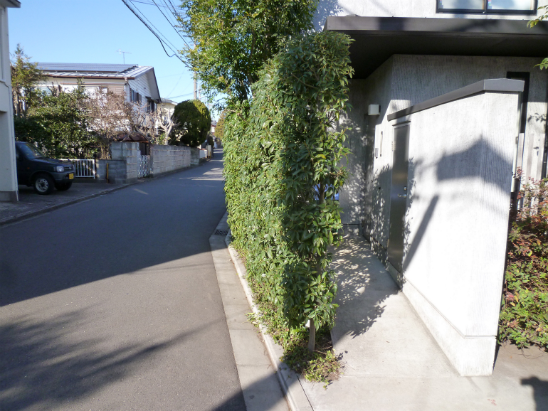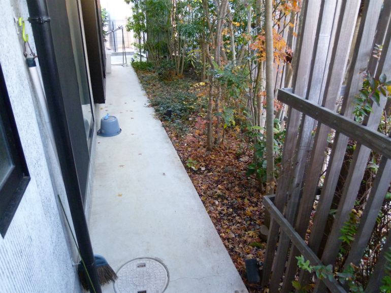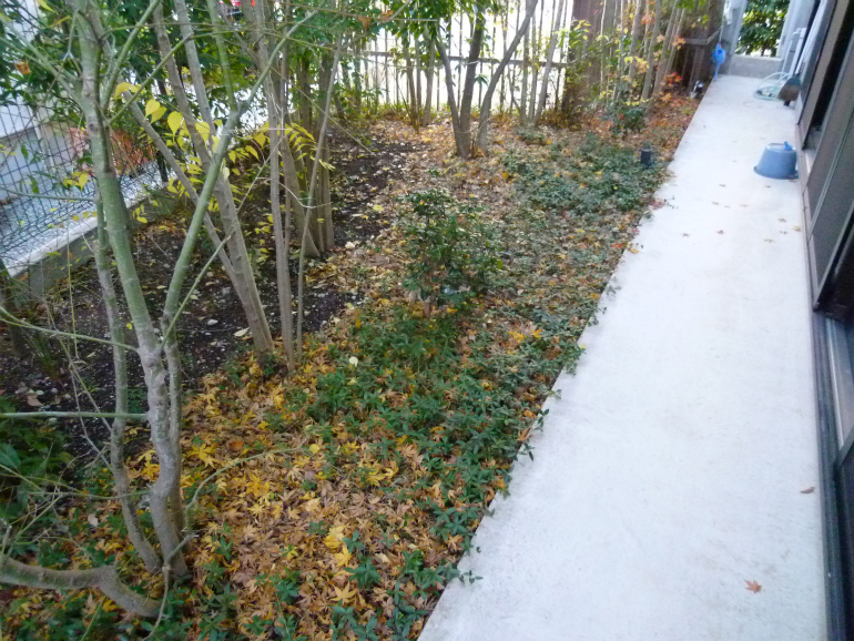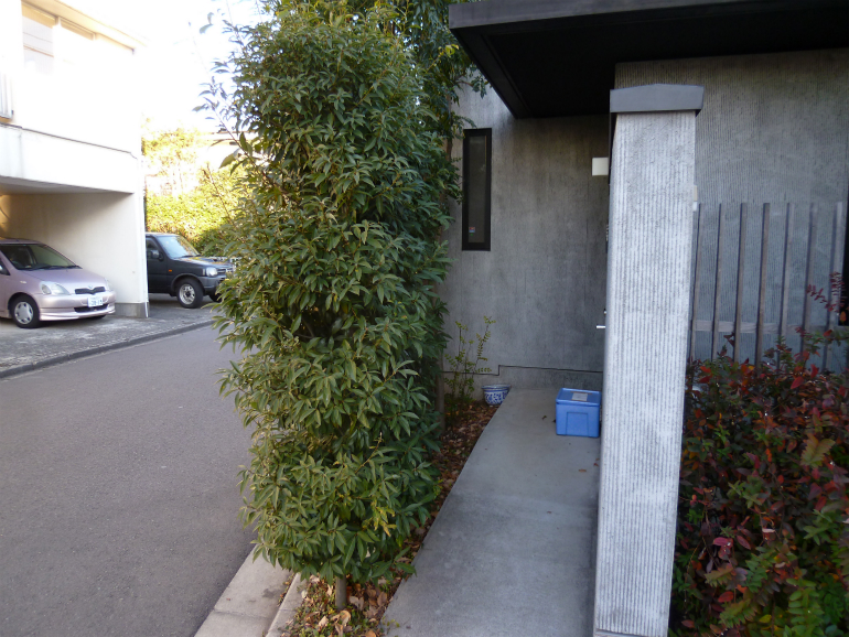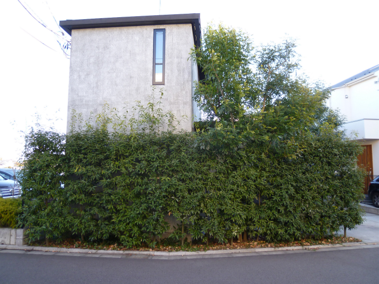 【 施工内容 】 カシ生垣 刈り込み、落ち葉掃除、人手による草取り