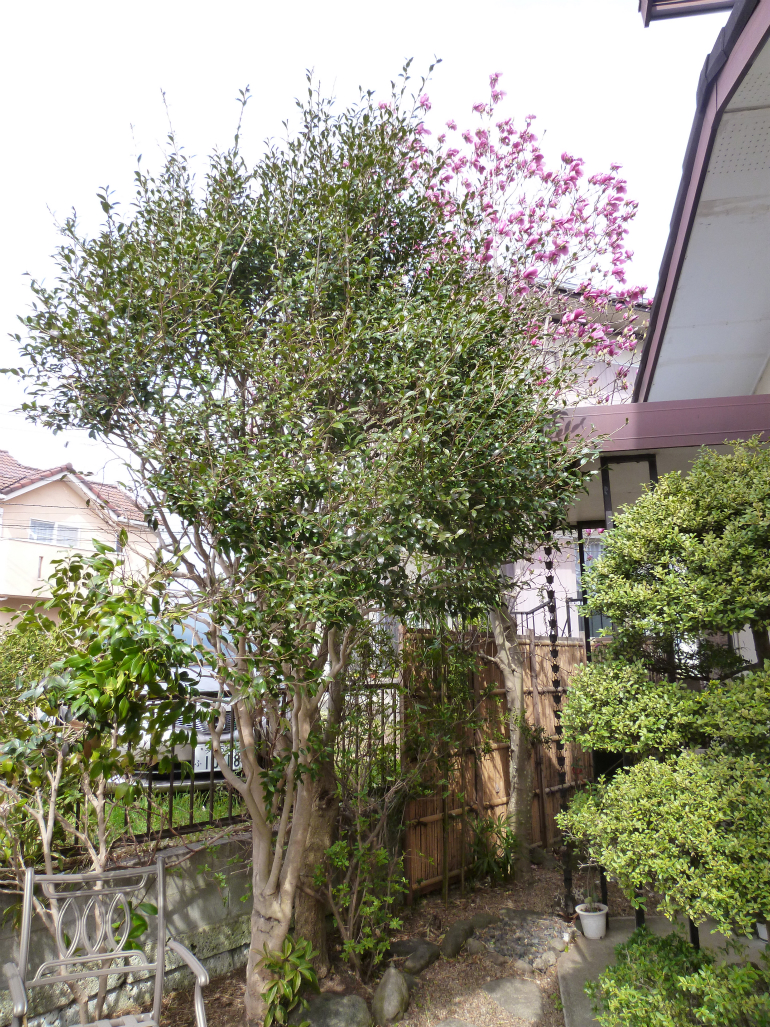 植木たちは、幹に近い部分は手が入っていなかったので、透かし剪定を行い、問題の紫モクレンは、お客様ご自身で手が届く範囲まで、小さくしました。