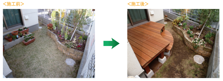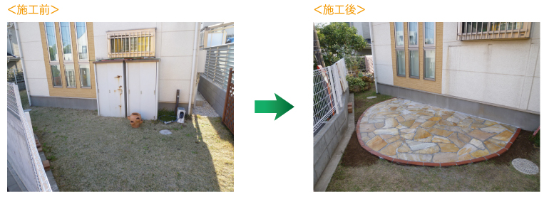 【 施工内容 】 1、ガーデンリフォーム 自然石乱貼り、ウッドデッキ設置
