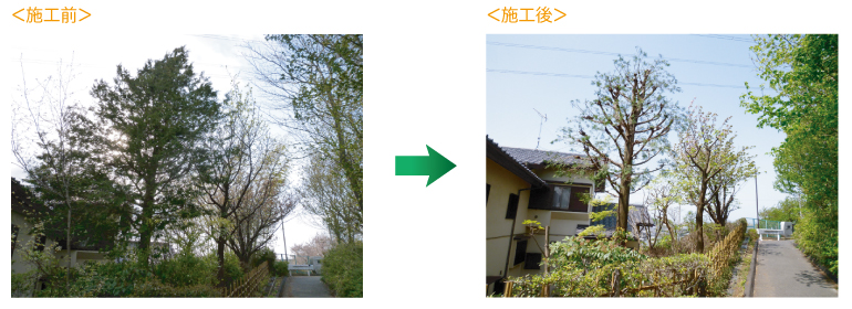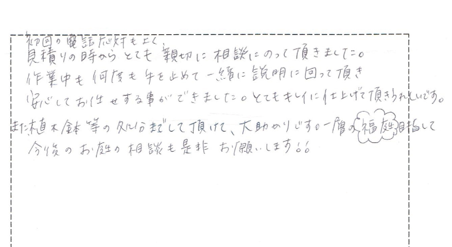 今まで、植木屋さんにお願いした事が無かったので、はじめは、どの様な人が来るのか不安でしたが、見積もりの時から、わからない事を詳しく丁寧に教えて頂き、心配なく頼む事ができました。