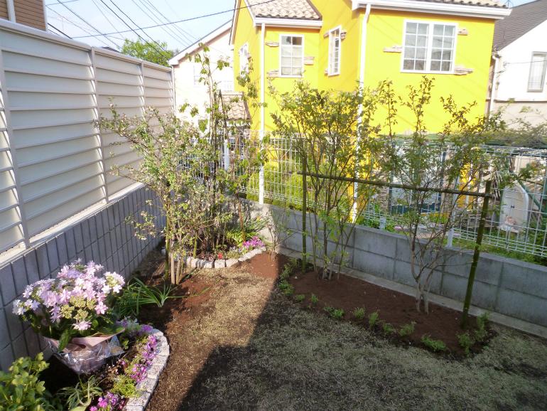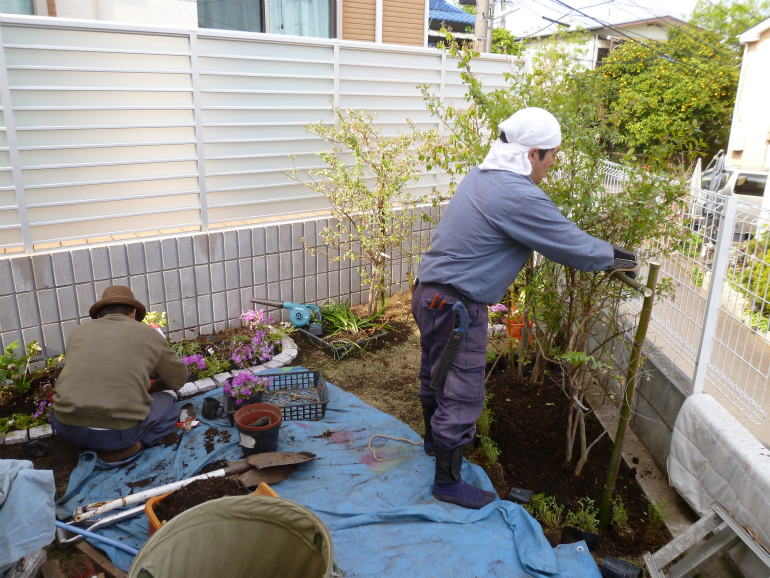 前回の工事の際に、土の状態が悪い事が分かっていましたので、植木にとって良い土に入れ替えを行いました。