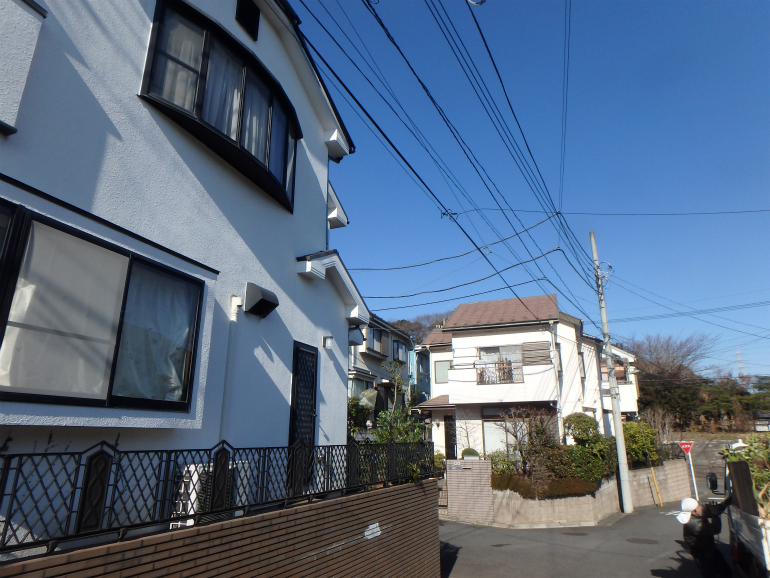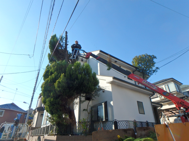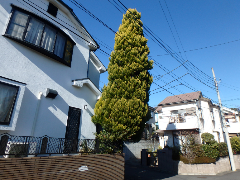 ゴールドクレストが、とても大きく育っており、すでに電線に寄りかかっているような状態です。