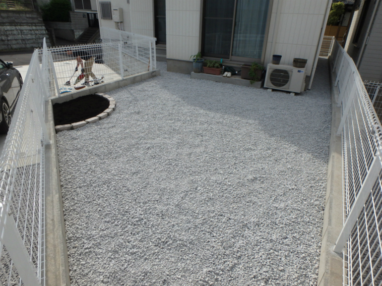 【 施工内容 】 雑草対策、防草シート張り、砂利敷き、花壇づくり