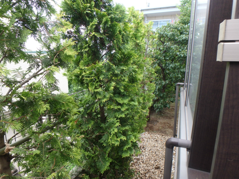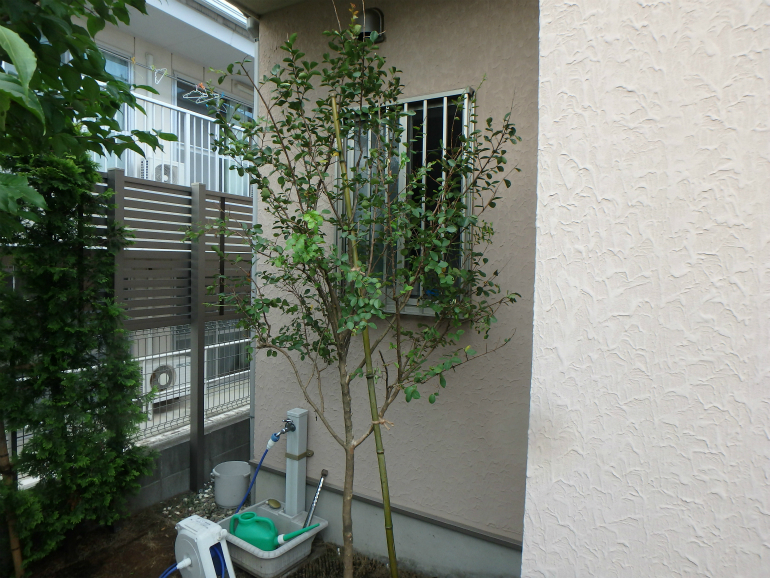 常緑樹が多いお庭で、窓の目隠し用に選ばれたサルスベリは、ピンク色の花を咲かせてくれますね。