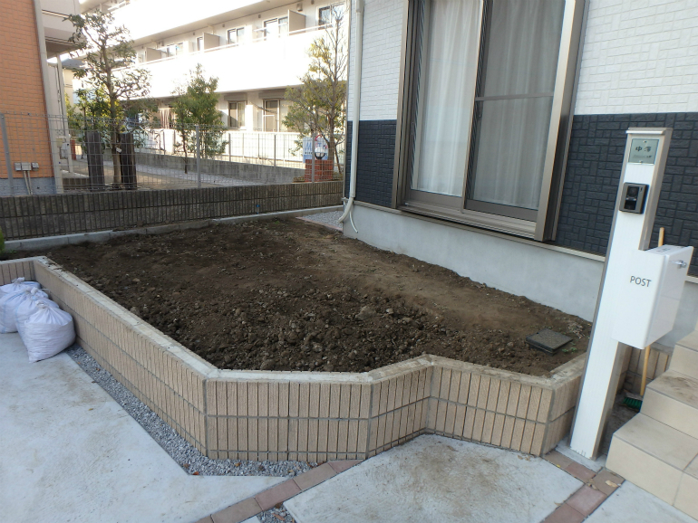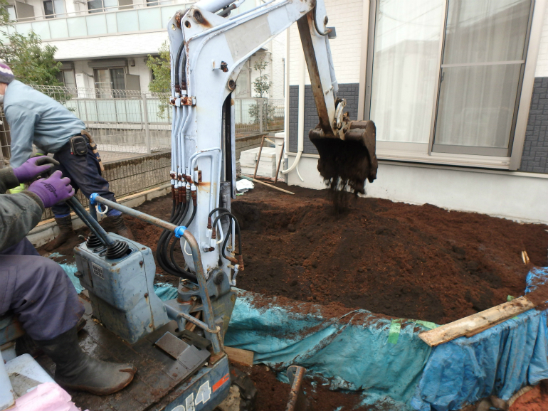 既に出来てある庭の土が、砂利が混じって硬く、質がとても悪かったため、土の入れ替え作業を行いました。