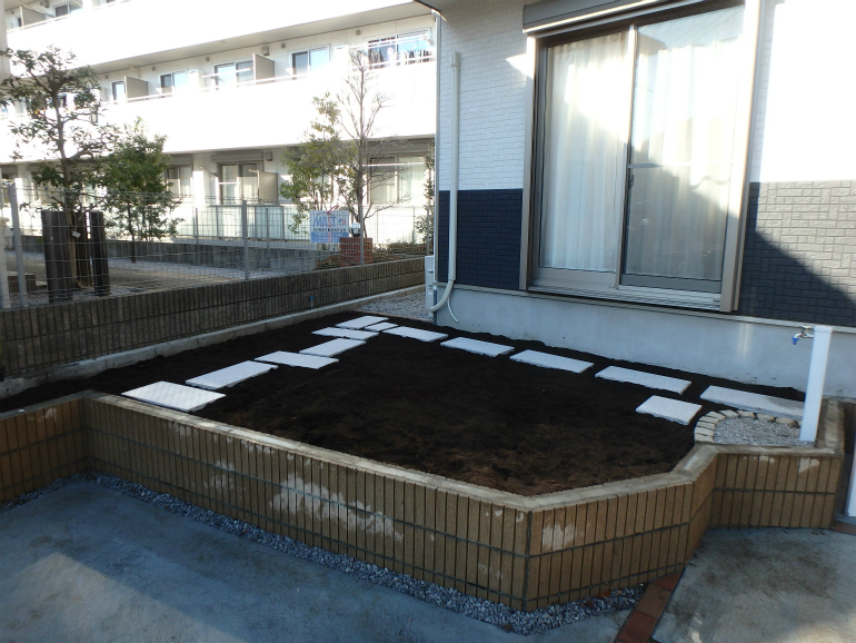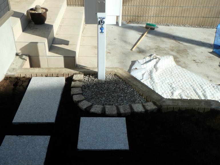 【 施工内容 】 土の入れ替え、平板敷き、立水栓設置