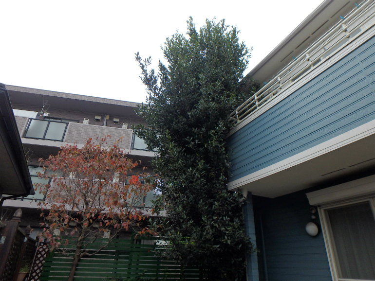 ひとめ見て、危険な状態であるとわかる大きくなりすぎたゲッケイジュを中心に、全ての植木を剪定お手入れさせて頂きました。