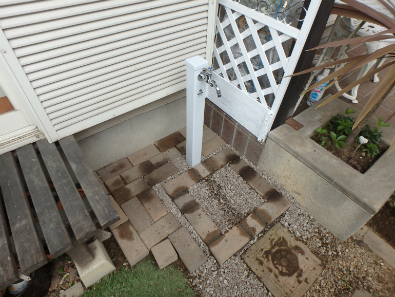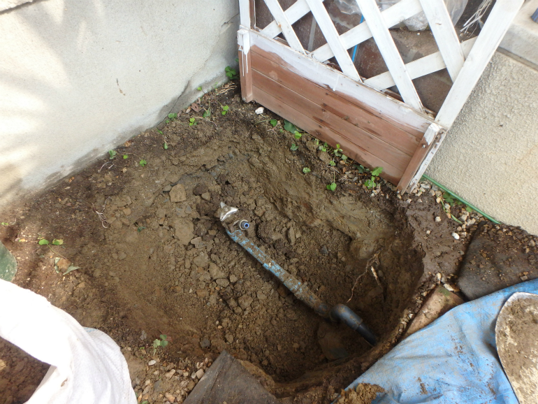 庭内にて、地中、地下に埋まっている水道を、立水栓へと交換する工事を行いました。