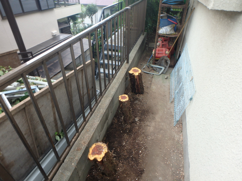根っこは、すぐには抜く事ができないため、地面から50cm程度の位置で、伐採し、切り口に穴をあけ、除草剤を注入、2〜3年で根っこまで枯れるような対応をしました。