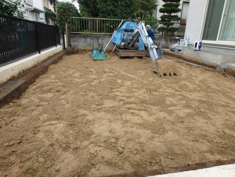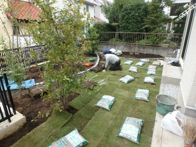 雑草がひどく、土が悪かったお庭から、芝生のお庭になるように、土の入れ替えを行い、