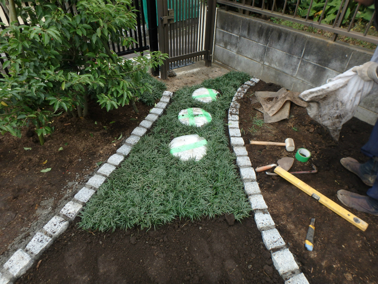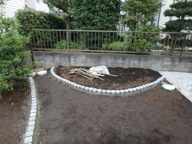 ガーデニングが出来るように、ピンコロ石を用いて、併せて花壇工事も行いました。