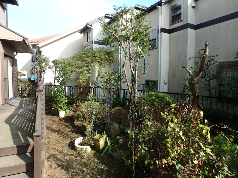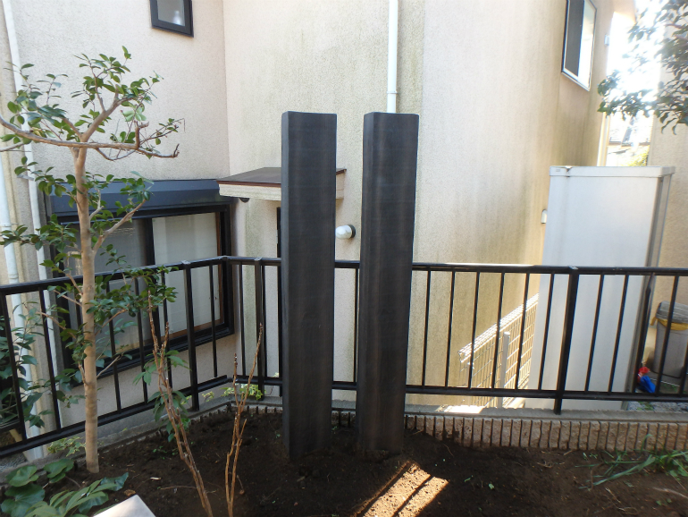 前にお住まいの方の好みのお庭から変更するため、ツツジやマキ、ツバキといった和風の植木を伐採、撤去作業を行い、代わりに、FRP性の人工枕木を建て込み、目隠しフェンス、スクリーンとしました。