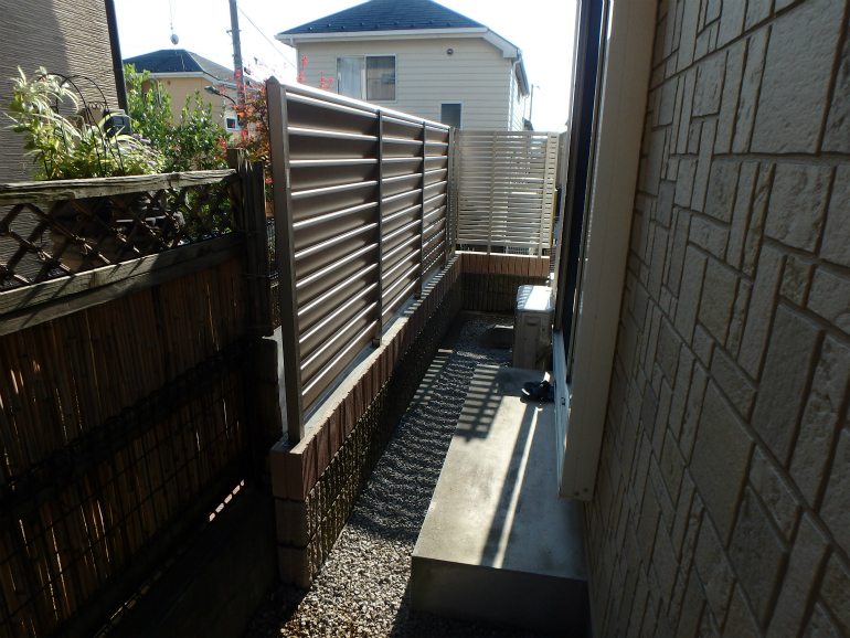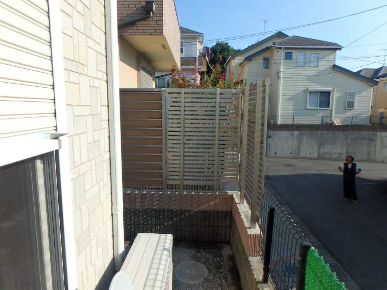 お隣との堺部分には、今までと同じ風が抜けるルーバータイプで、アルミ製のフェンスを用いました。