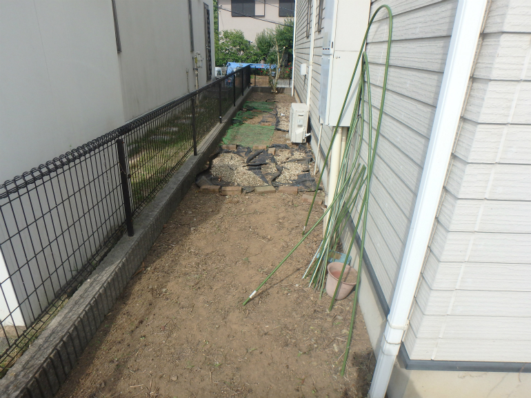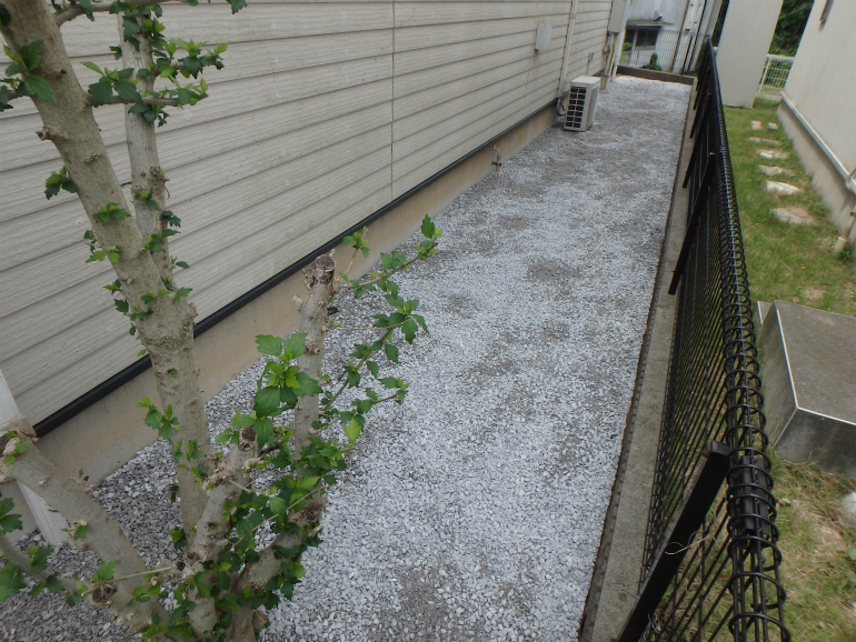 今回、裏庭、通路部分の雑草を、もう生えてこないように、防草シートと、砂利を使って雑草対策を行いました。