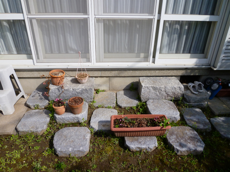 以前依頼していた植木屋さんに、普段、出入りには全く使わない掃き出し窓の目の前に、靴脱ぎ石を設置されたとの事で、一番使う部分に移動しました。