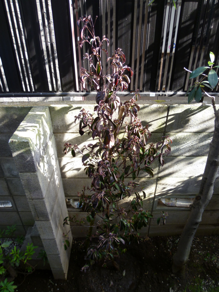 長年そのままの、下の部分に葉っぱが出ていないカイヅカイブキを撤去して、花が咲く常緑のヤマボウシ「ホンコンエンシス 月光」と交換しました。