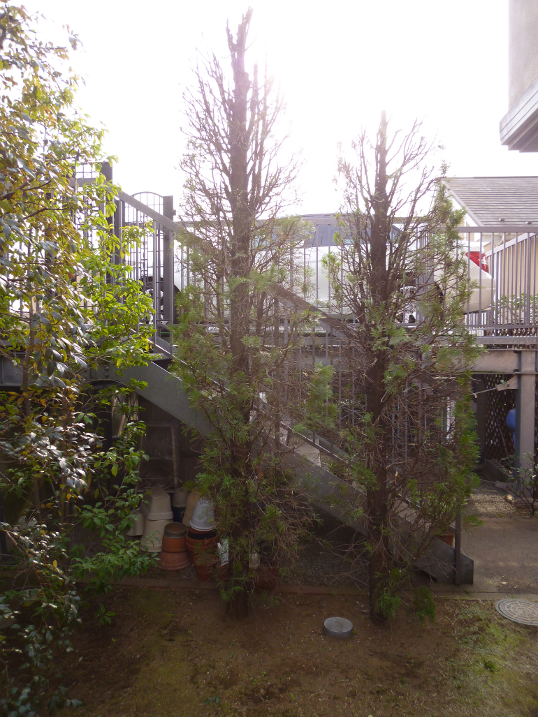 今回強めに刈り込んだので、また葉っぱが出てきて、2〜3年するとまたコーン型に緑になってくれます。