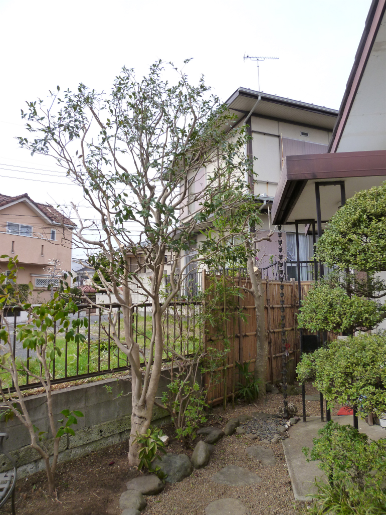 植木たちは、幹に近い部分は手が入っていなかったので、透かし剪定を行い、問題の紫モクレンは、お客様ご自身で手が届く範囲まで、小さくしました。