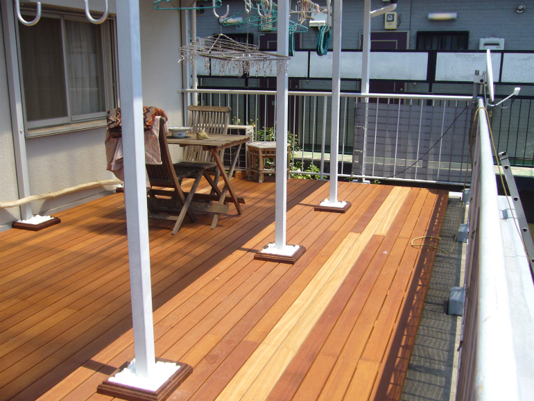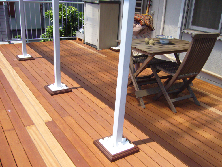 デッキ材として使う材木は、セランガンバツと呼ばれるとても堅く丈夫な材で、デッキ材として、とても優秀ですね。