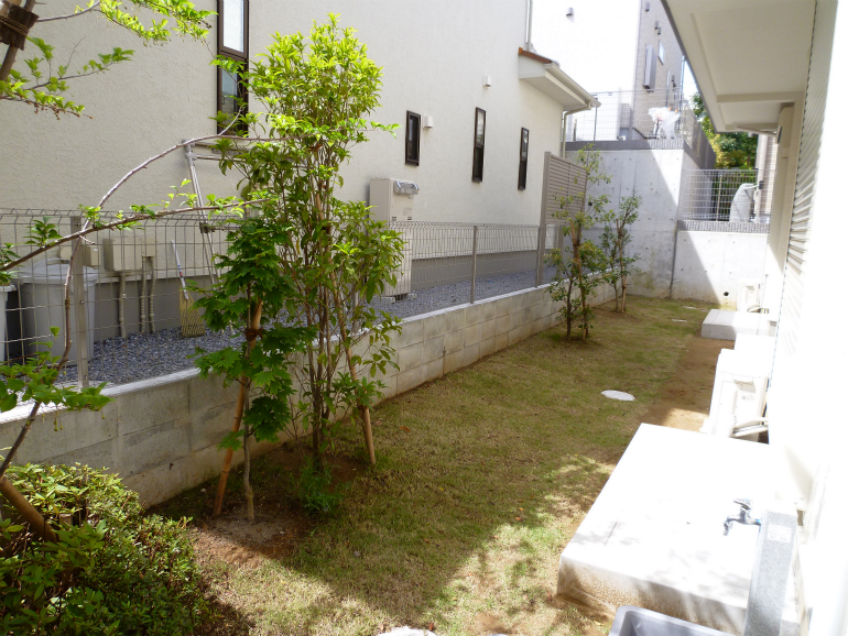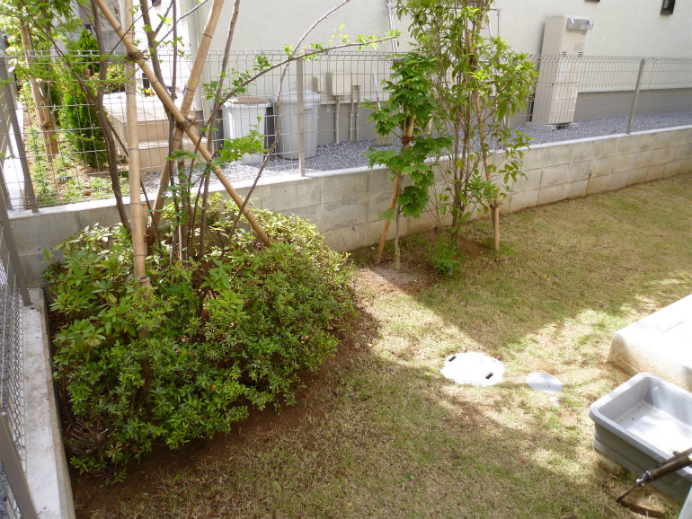 こちらの新築住宅をご購入したものの、ご自分のこだわりの植木に入れ替えたいとの事で、お客様ご自身で手に入れた、珍しいイタヤカエデの植え付け、