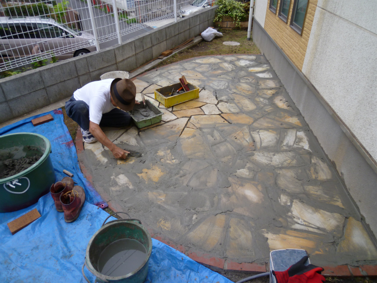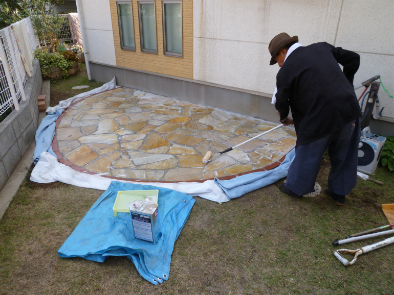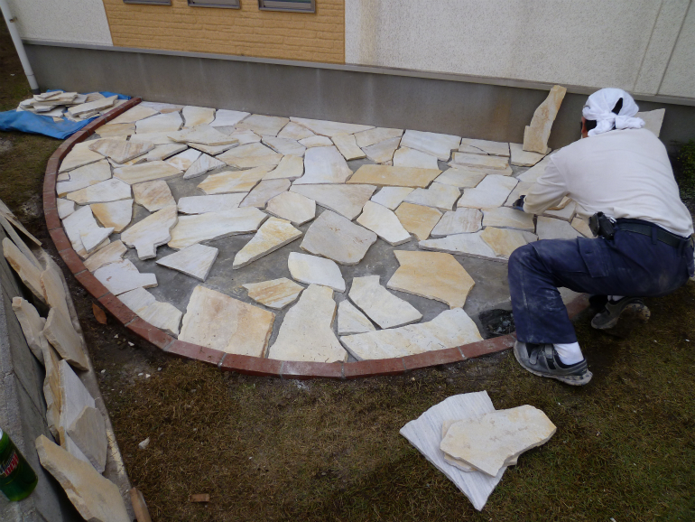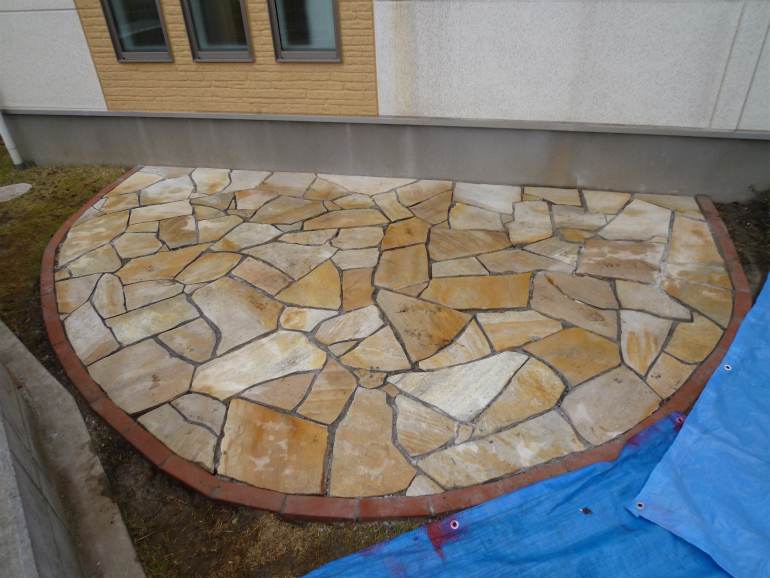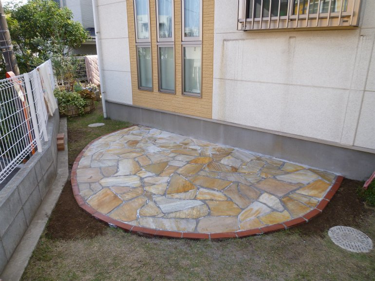 主庭側は、ご家族でご検討して頂いた際に、自然石を使ったテラスをご希望との事でしたので、ブラジル産のサントメクォーツという石を使ったテラスを作りました。縁取りを赤レンガで綺麗に作る事によって、芝生の緑、レンガの赤、自然石の黄色や白といった、色のコントラストができ、お庭が明るく素敵になりました。