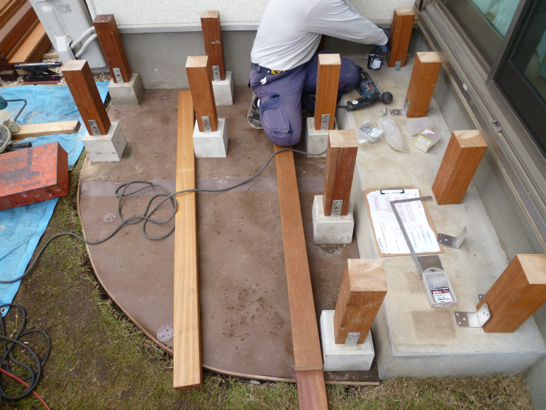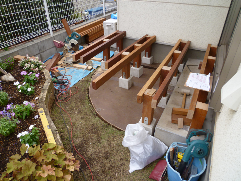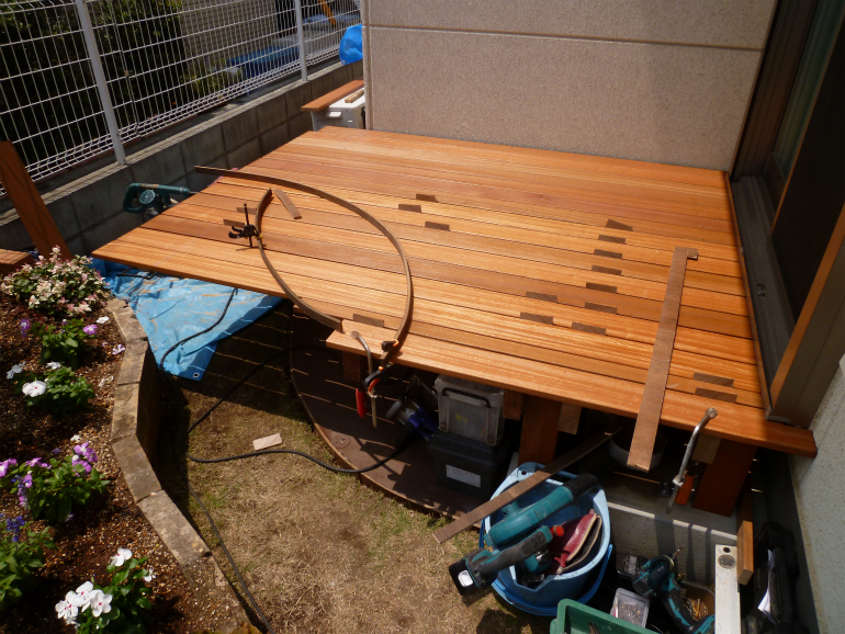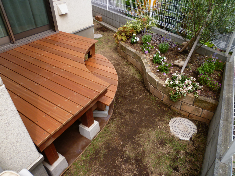 すでに、素敵なレンガ花壇が出来ておりましたので、ウッドデッキの形状をグランドピアノのようなR状に仕上げることで、通路の確保、圧迫感の軽減に成功しました。