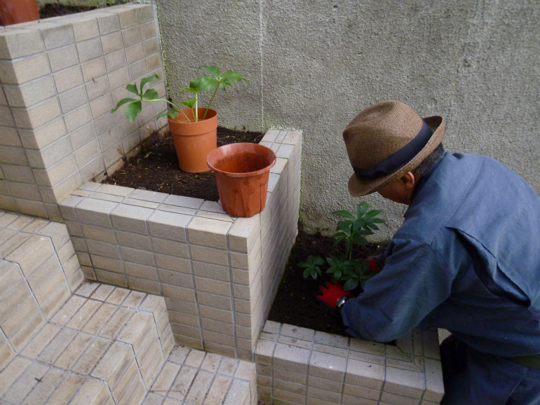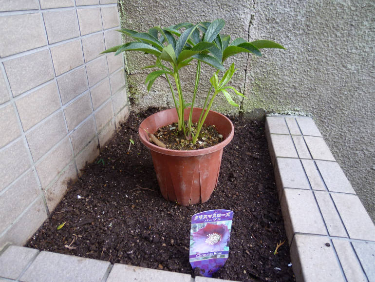 新しくクリスマスローズを植える事にさせて頂きました。クリスマスローズは、お花が首をかしげるように咲いてくれるので、今回のような植えマスである、1段高くなっている場合には、下から見上げてお花が観賞できるので、とても良く合いますね。