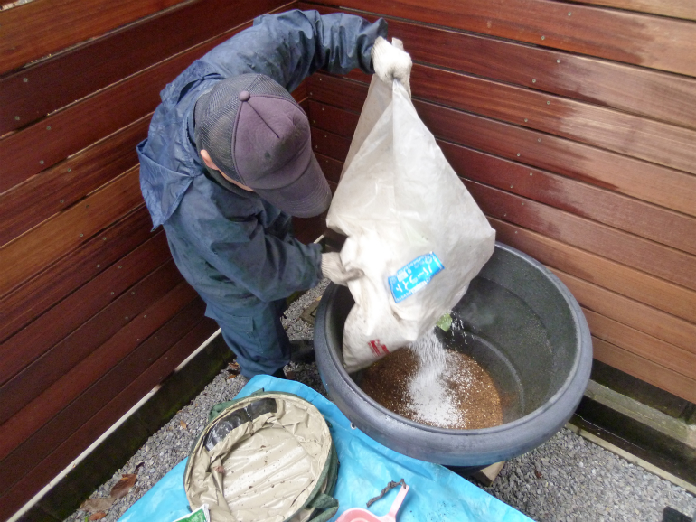 2m以上ある大きいものをご希望でしたので、根鉢に併せて大きい植木鉢を用意させていただき、植えつけました。