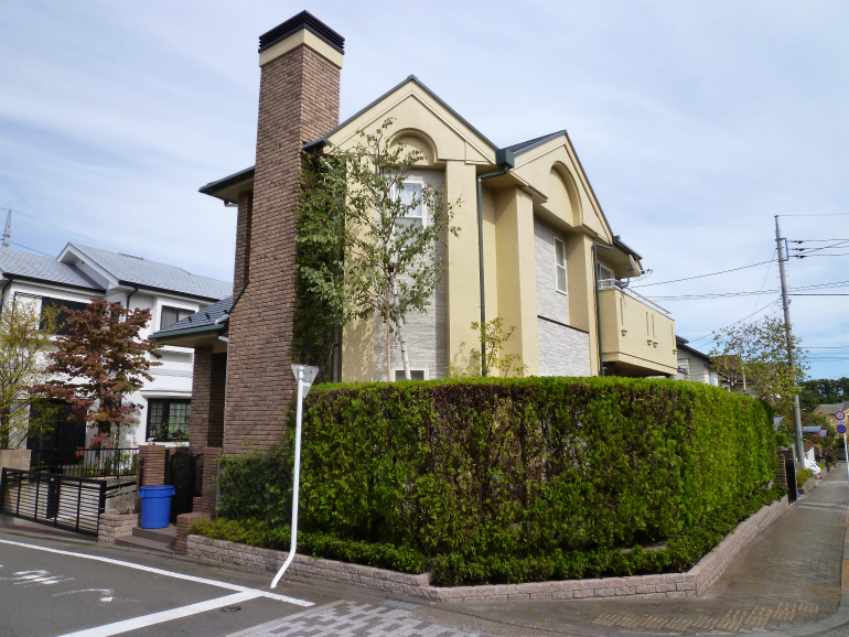 作業完了後、外から見ると、黄色の素敵なお家に、とても良く合う色具合に植木を整える事が出来ました。