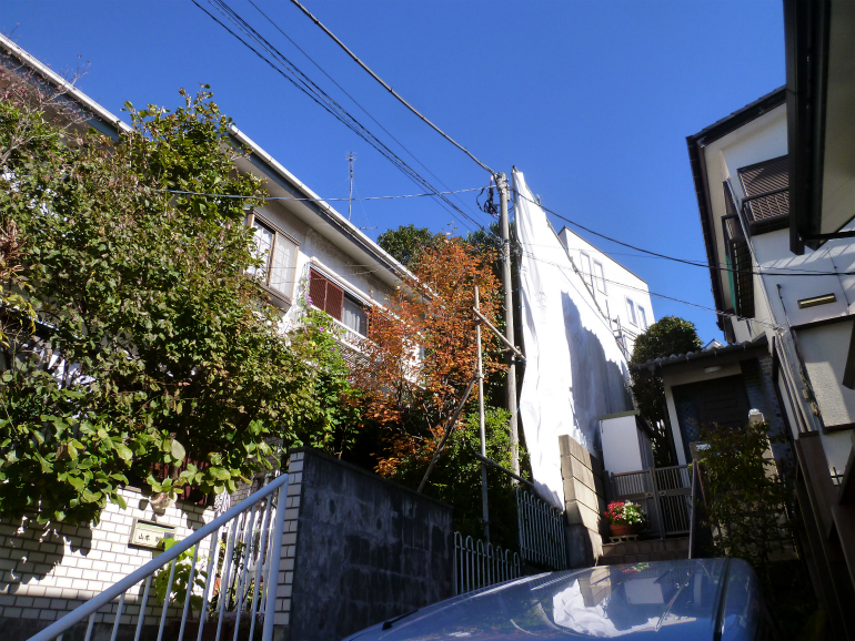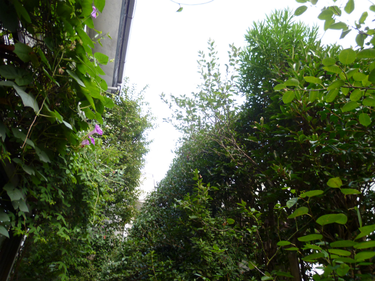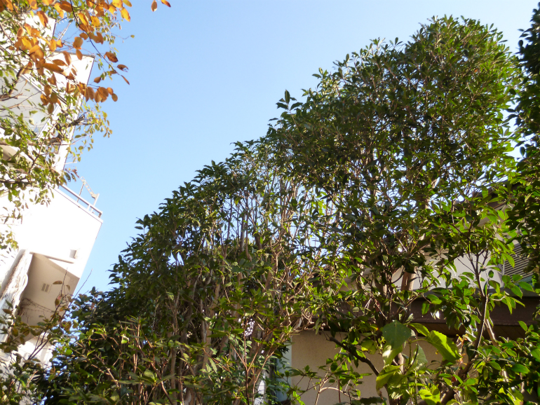 サンゴジュ、キンモクセイ、ツバキ、サザンカからなる大きな生垣、お隣のお宅側に枝が境界を越して伸びて行きそうな部分を強めに刈りこむことになりました。その際には、お隣に枝葉が落ちないよう、また職人さんの安全確保の為に、足場とネットを組ませていただき、万全の状態で作業を行わせて頂きました。