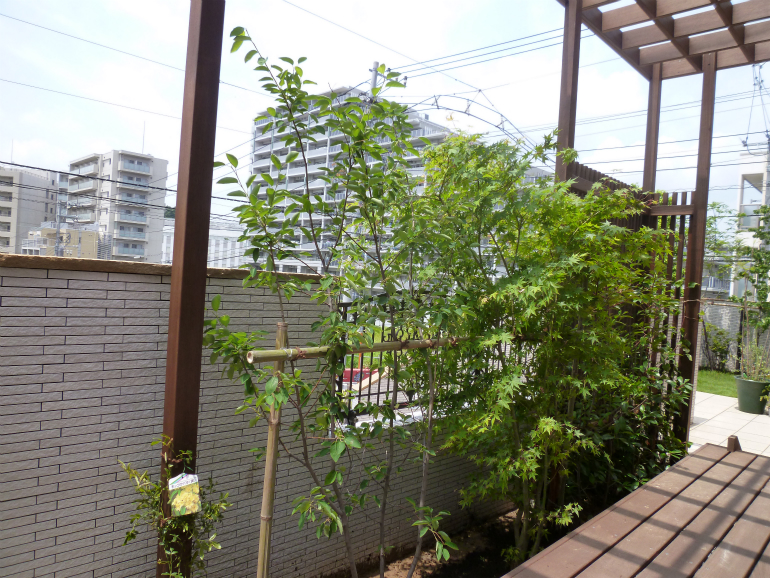 目隠しは、ウッドでフェンスが主に役に立ってくれるようでしたので、落葉樹を植えさせて頂きました。