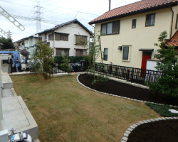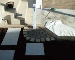 【 施工内容 】 砂利敷き工事、花壇設置工事、植栽工事
