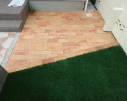 【 施工内容 】 1、レンガ花壇作り 2、広場レンガ舗装 3、通路用平板敷き