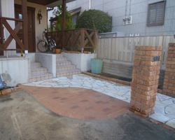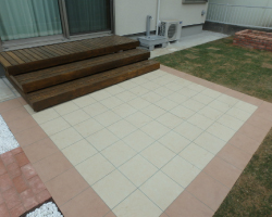 砂利敷き工事、レンガ花壇工事、ウッドデッキ工事、タイル工事、植栽工事