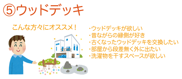 いずれの材質を選ぶにせよ、ウッドデッキは、外で使うものですので、日頃から、雨・雪・風・太陽光を、直接受けます。